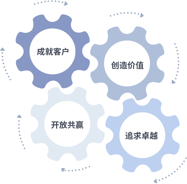 成就客户是一切决策的出发点,,,创造价值是衡量所有工作的标准,,追求卓越是我们做事做人的态度,,开放共赢是我们的格局也是最终的结果。。。价值观的齿轮环环相扣,,,推动着组织里的每个人不断向前。。